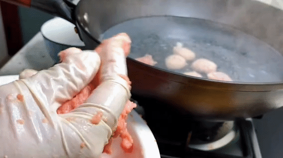 Pour an appropriate amount of water into a pot and heat until small bubbles appear at the bottom (about 70–80°C). Reduce the heat to low. Take a small portion of the seasoned meat mixture, shape it into a ball with your hand, then gently lift it with a spoon and place it near the surface of the water in the pot.