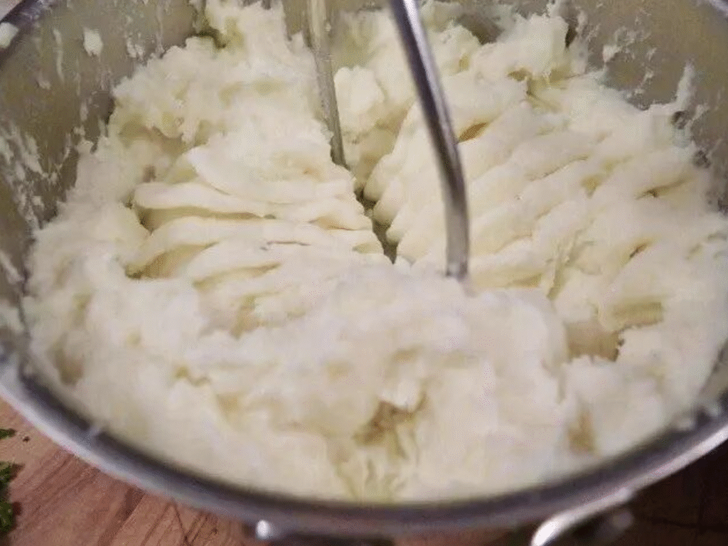 Be careful with pot size, as potatoes tend to cause boiling over. Drain the water, add the cream, then mash using a potato masher or a hand blender — the latter is actually a secret weapon used in high-end restaurants. Mash until smooth and lump-free, then season with salt.